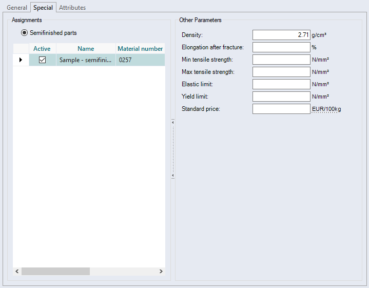 | Semifinished parts | Multiple semifinished parts can be added and multiple ones be actively assigned. Setting up such an assignment allows costs for the basic material that are based on the validity period to be entered for the semifinished part. |