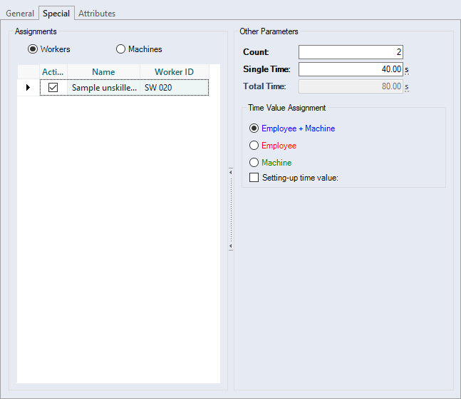 | Worker + Machine | Assign the single time value to a machine and a worker |