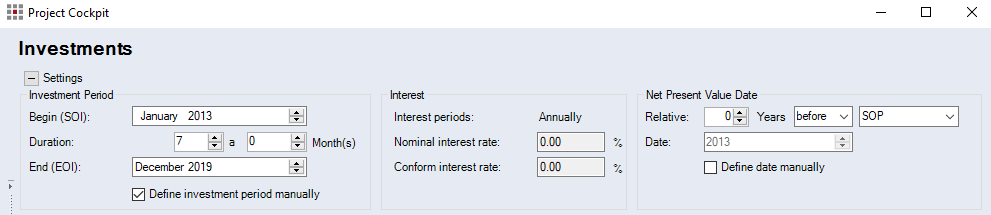Enter the investment period in years (a) or months. The investment end date (EOI) is automatically set according to the entered duration. The application ensures that the investment period is longer or equal to the production period.