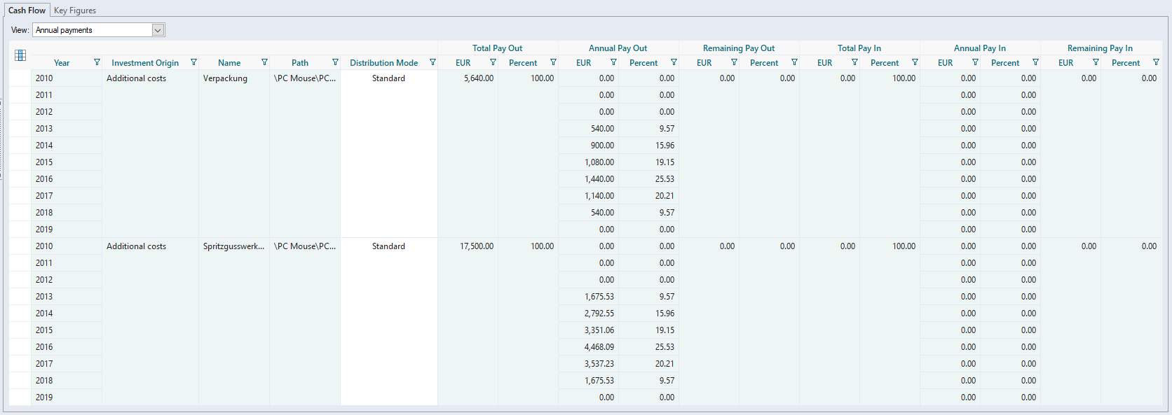 Selection of the cash flow course per investment origin The distribution mode determines how the cash flow is being distributed over the investment period/project period.