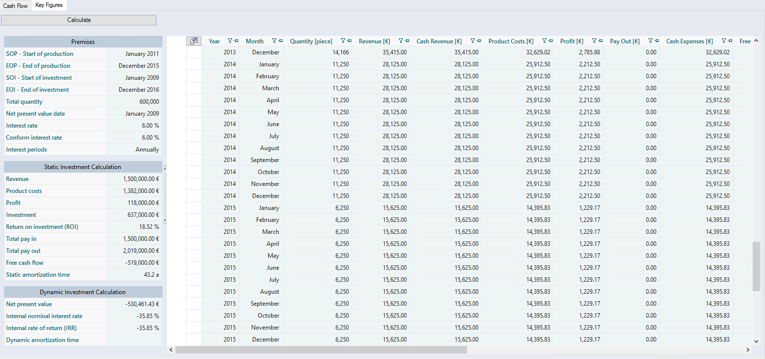 The calculation of the investment key figures is based on the premises defined in the project. The following premises are shown in FACTON: