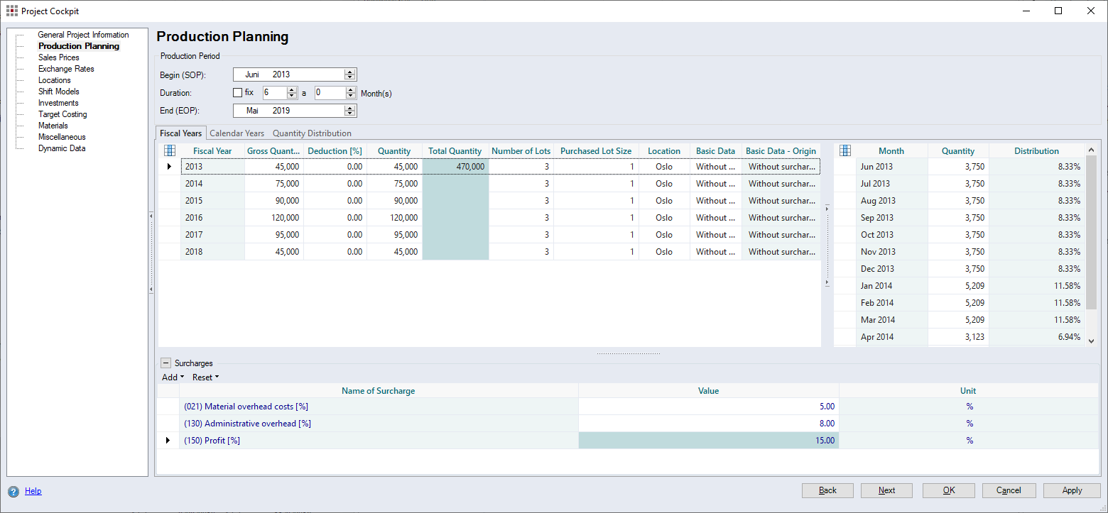 The production planning of a project can be found in the Project Cockpit dialog. The project duration, quantities and surcharges are defined here.