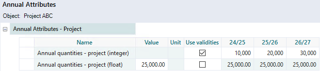 In addition to usual attributes, annual attributes can be used here at individual object levels in the project depending on validity periods, for example as quantity values per fiscal year. The values can either be defined generally for all years in the "Value" column, or be entered individually for each year by activating the "Use validities" checkbox.