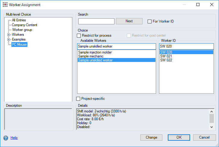 When the checkbox is activated, the worker is automatically added on a project-specific basis. You can define labor cost properties for an worker independent of Data Administration. If you do not activate the checkbox, only the basic hourly rate is used to calculate labor costs.