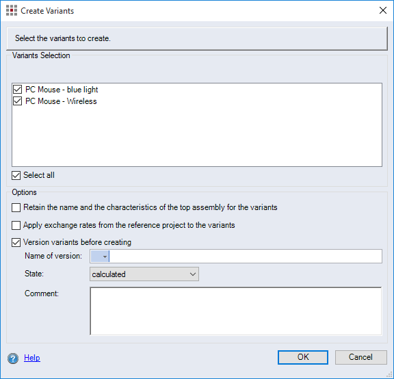 When this checkbox is activated, all of the listed variants are selected and generated after confirming the entries and exiting the dialog.