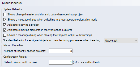 Enter the number of recently opened projects to be shown in the main menu "Projects". If more than 5 projects are to be displayed, and if more than 5 projects are available for selection, the menu item "More elements" will appear in the "Projects" menu. Click this menu item to open a dialog showing all projects available for selection.