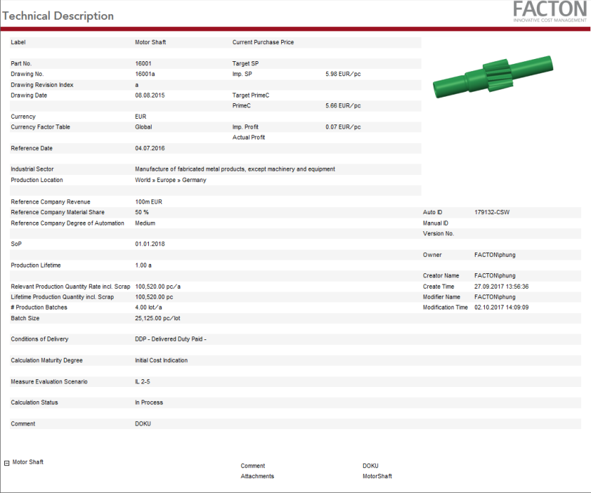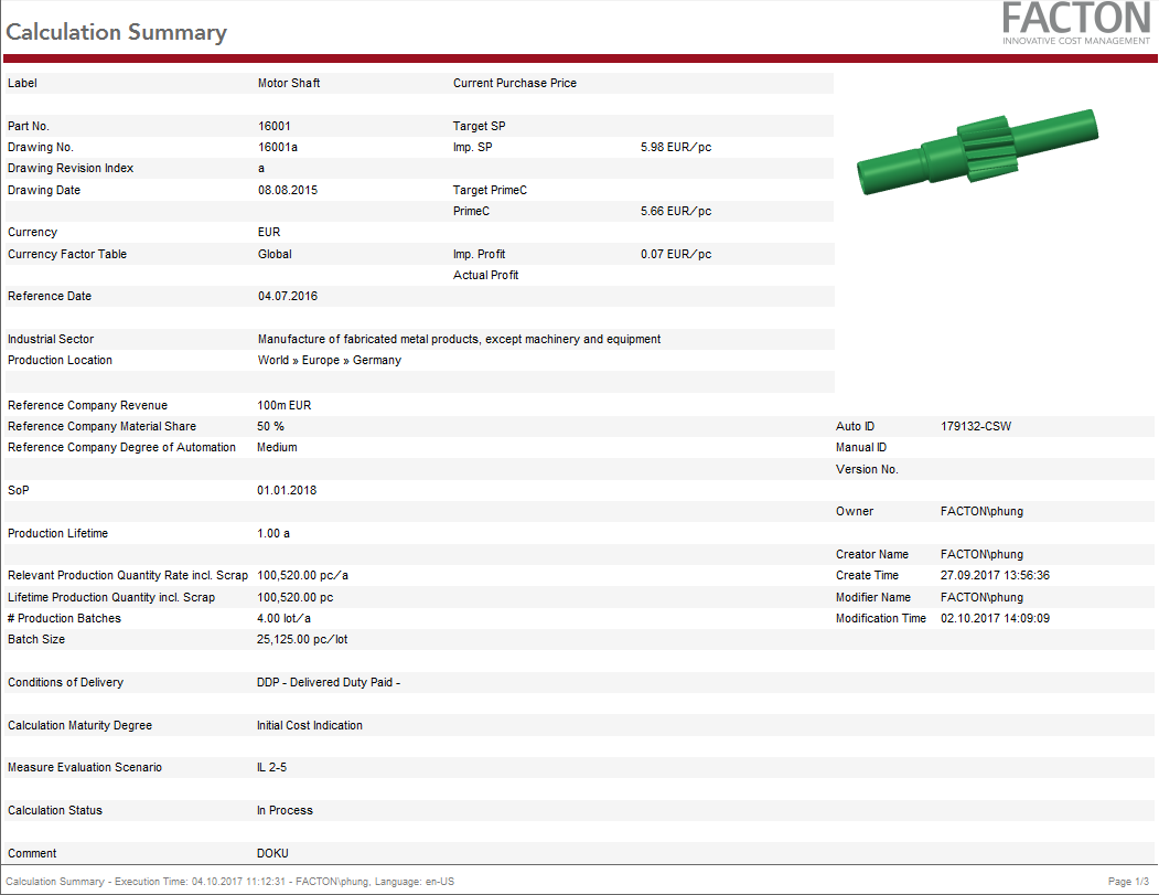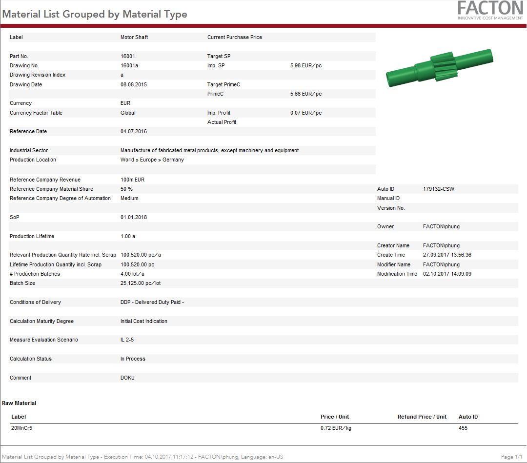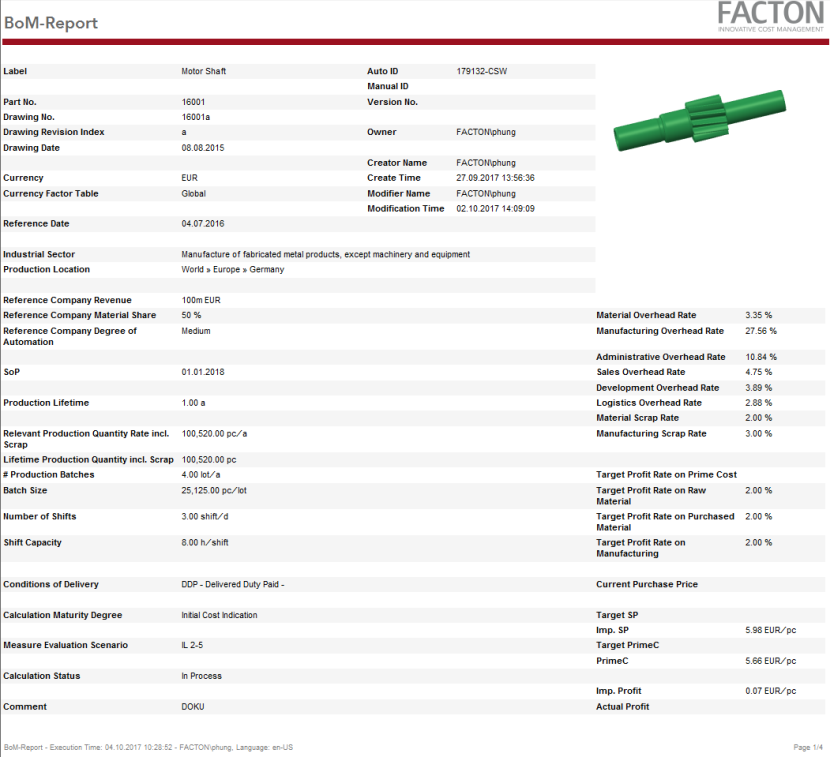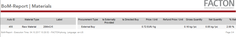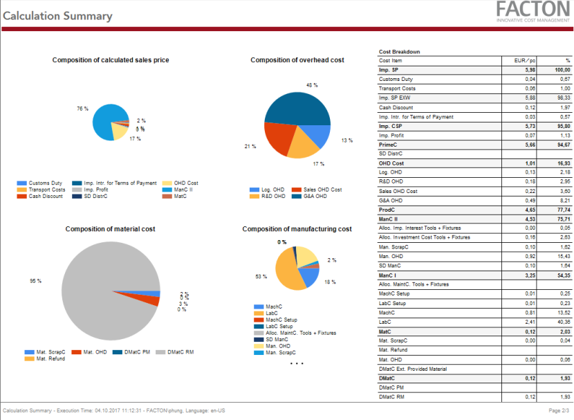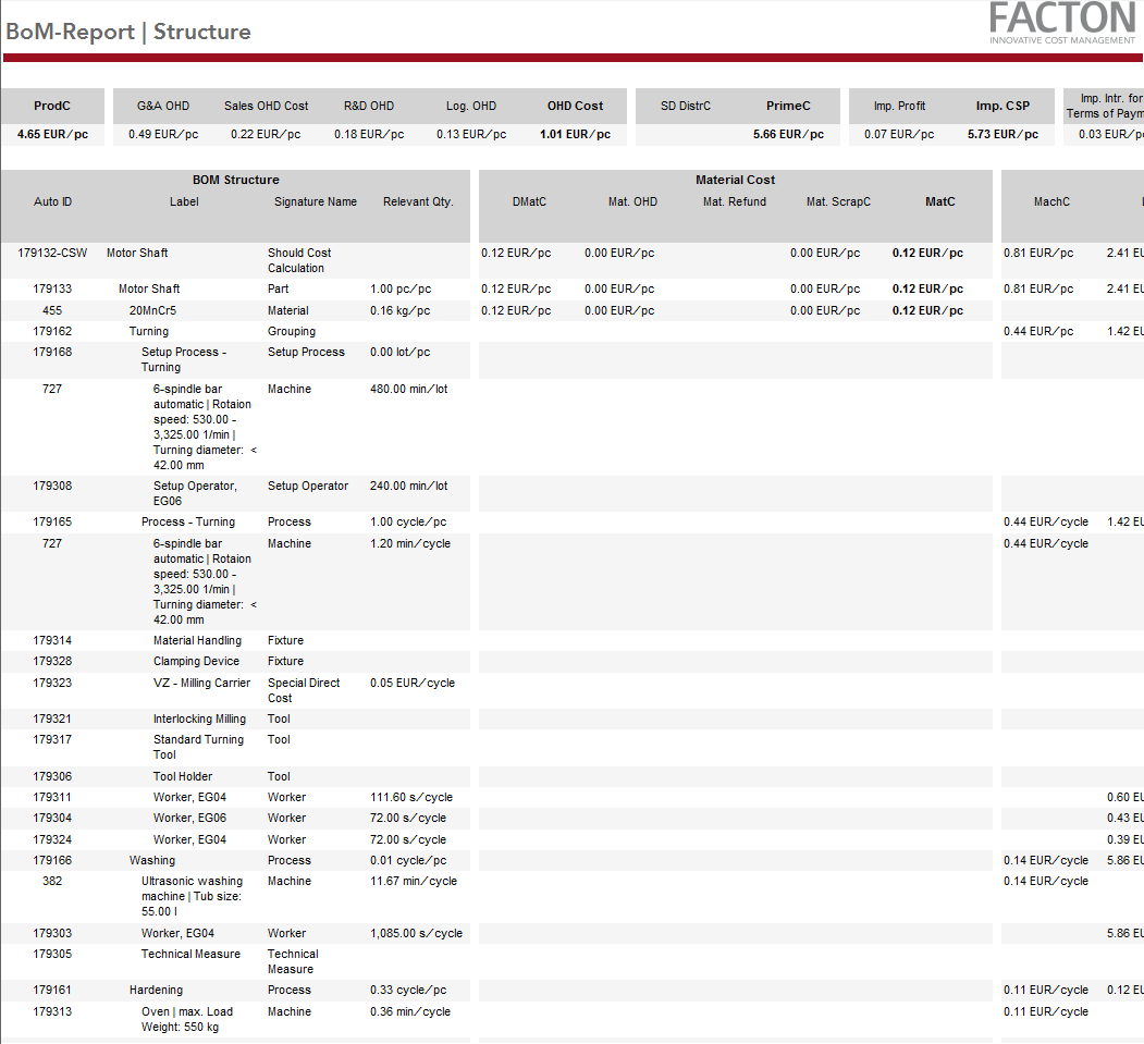 This report provides you with a summary on the cover page with general data and key figures on the target cost calculation, an overview of the BoM including costs (current material situation) along with key figures on the materials used and production.