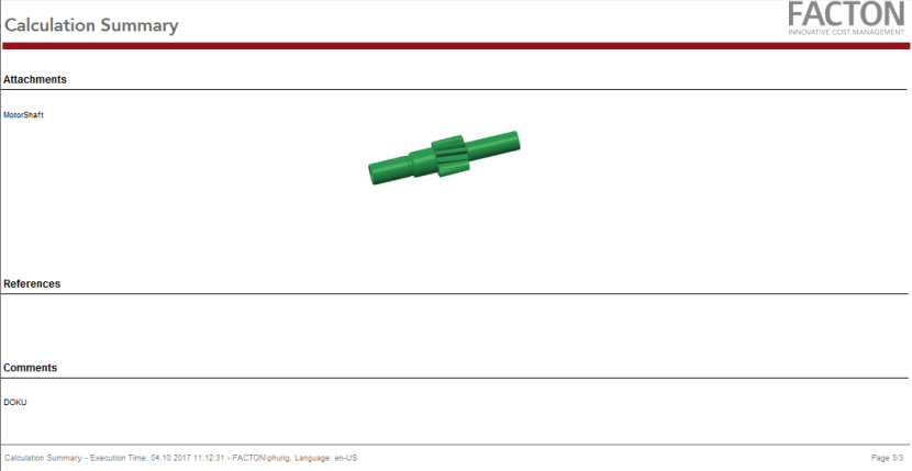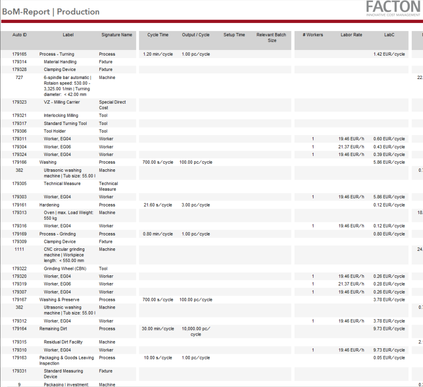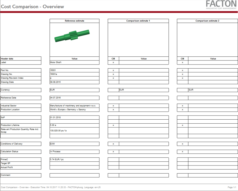 To obtain a summary of your should cost calculation, materials or technical descriptions you can export the following calculation reports or a comparison report for your calculation or export it as an Excel, PDF or Word file in FACTON.