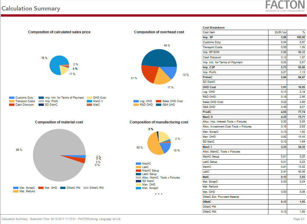 This report allows you to present all of the costs of your calculation as a table or graph and receive an overview of the following calculation aspects: