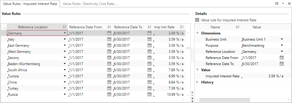 You can define company-own overhead rates, such as the material / manufacturing / administrative / sales / development and logistics overhead rate, under Global Properties ► Overhead Rate. The overhead rates depend on the following dimensions: