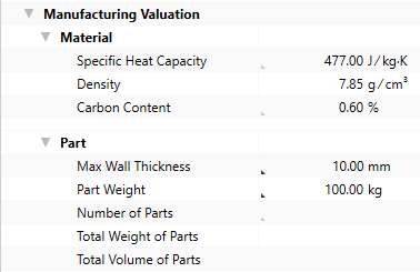 The part properties used to calculate the cost model are shown in this group.
