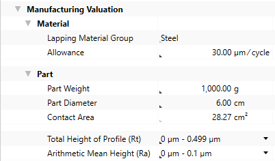 You can use the Calculate Lapping cost model to calculate the process times and costs for the lapping manufacturing process. In FACTON, there are value rule tables and formulas defined at the cost model providing you with information on: