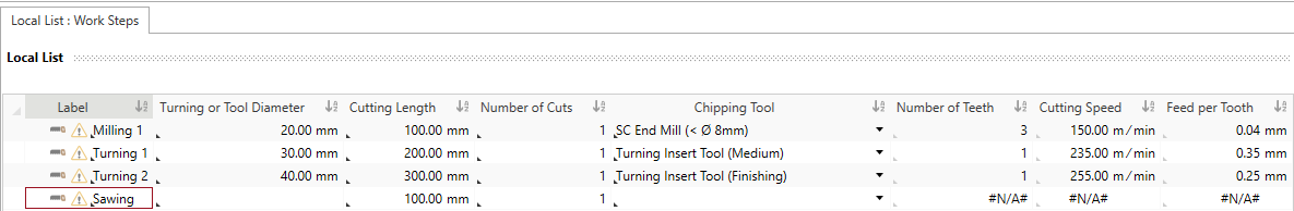 The work step properties in the chipping process used to calculate the cost model are shown in this group. The button opens the Local List: Work Steps tab where you can manage the work steps.
