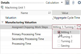 2. In the Details > Calculation > Manufacturing Valuation > , click on the combobox next to Assigned Chipping Work Steps.