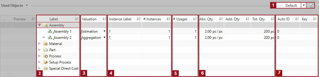 The Used Objects view shows all calculation elements that are used in the Structure view. Relevant properties and values of the calculation elements are displayed, which you can check and quickly edit in this view.