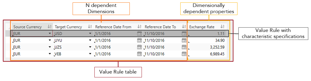 Clicking a property opens a new tab with a value rule table for the selected property. The value rule table shows the global property and all properties on which it depends in the column header. The data records (rows) display the concrete values of the global property and their dependent values.
